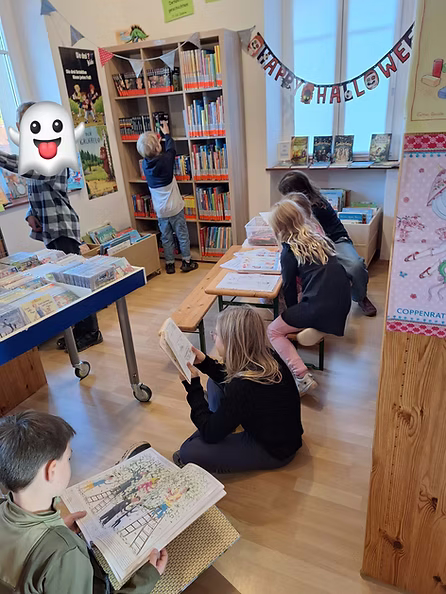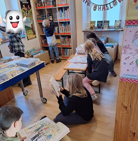 Drei Tage vorher empfingen sie 14 Kinder in der Familienbücherei. Zunächst lasen Ulrich Müller und Herbert Then den Kindern Gespenstergeschichten vor.