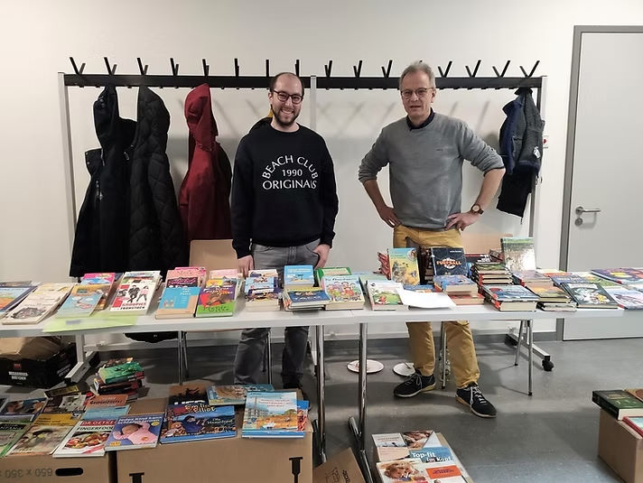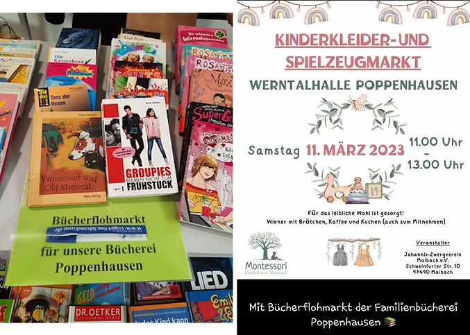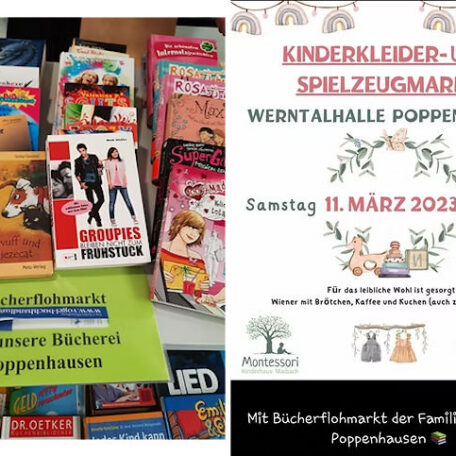 Gerne nutzten Ulrich Müller, der Leiter der Familienbücherei, und Nicolas Rost vom Büchereiteam die Chance, beim Kinderkleider- und Spielzeugmarkt, den der Johannis-Zweigverein Maibach (Montessori-Kindergarten) veranstaltete, präsent zu sein. Ließen sich doch zwei Fliegen mit einer Klappe schlagen: zum einen fanden aussortierte Medien noch einmal einen neuen Besitzer und zum anderen konnten gerade junge Familien auf das umfangreiche Angebot der Familienbücherei Poppenhausen aufmerksam gemacht werden!