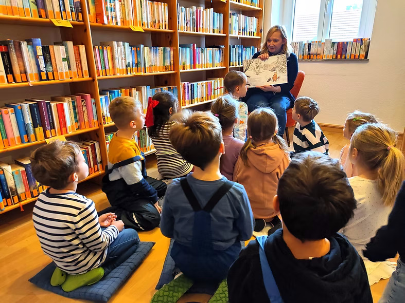 Manuela König vom Büchereiteam liest den Vorschulkindern vom Kindergarten Kronungen das Buch „Dr. Brumm versteht das nicht“ von Daniel Napp vor.